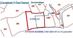 Çanakkale ili Ayvacık ilçesi Bademli 202 ada 44 parsel 1.636.-m2 21 parsel ise 3.400.-m2 den olmak üzere 5.036.-m2 sahil kullanımlı sahile komple taş bariyer duvar çekilmiş,arazinin düzenlemesi yapılmış,setler halinde bölümler oluşturulmuş, İlk sahile yakın taştan malikhane gibi yapılmış üst sete ise 12 adet taş odalar inşa edilmiş vaziyettedir.